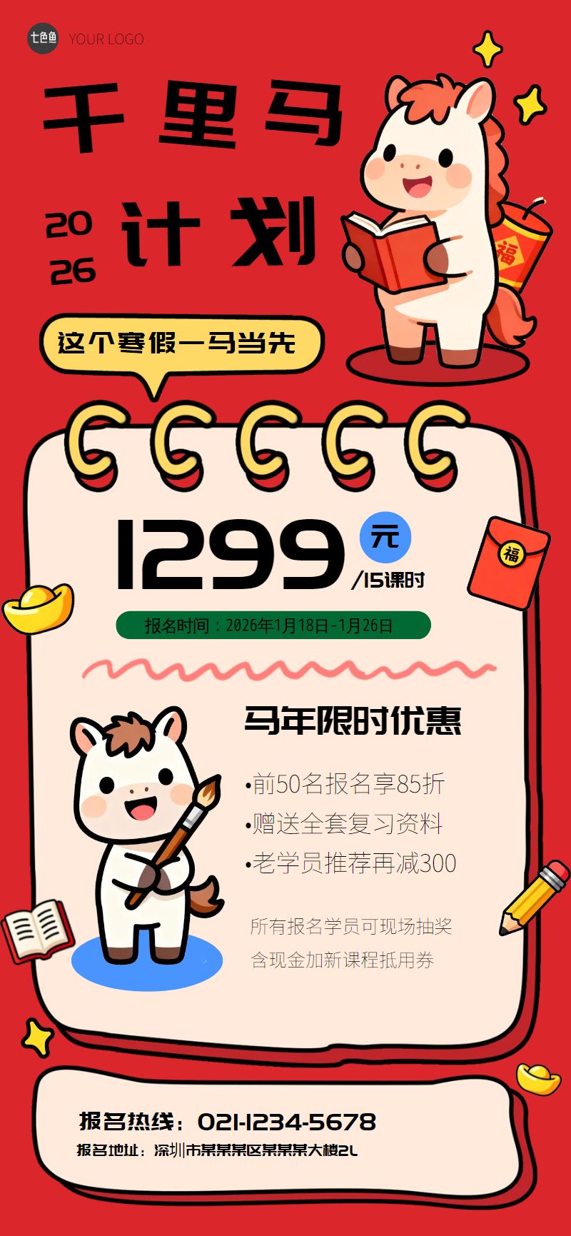 卡通手绘马年寒假班招生全屏海报是设计师 笨笨的作品,模板尺寸为720*1280px,属于?社交>?手机海报模板 ,模板图片素材均支持免费下载,在线就近下单印刷。操作简单易懂,会打字就会做设计,七色鱼界面友好上手快,可适用于多种场景。七色鱼拥有海量模板素材,30万+模板免费用,行业覆盖丰富,全部模板只需拖拉拽,轻松改。满足中小型企业、创业公司、自媒体、学生和个体经营者的自助平面设计需求,还可进行云端储存管理、分享协作、营销传播、在线下单印刷等。