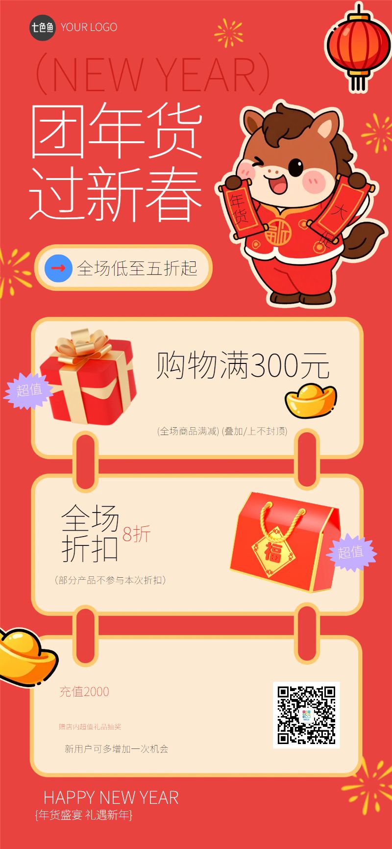 卡通马年春节节年货全屏海报是设计师 笨笨的作品,模板尺寸为720*1280px,属于?社交>?手机海报模板 ,模板图片素材均支持免费下载,在线就近下单印刷。操作简单易懂,会打字就会做设计,七色鱼界面友好上手快,可适用于多种场景。七色鱼拥有海量模板素材,30万+模板免费用,行业覆盖丰富,全部模板只需拖拉拽,轻松改。满足中小型企业、创业公司、自媒体、学生和个体经营者的自助平面设计需求,还可进行云端储存管理、分享协作、营销传播、在线下单印刷等。