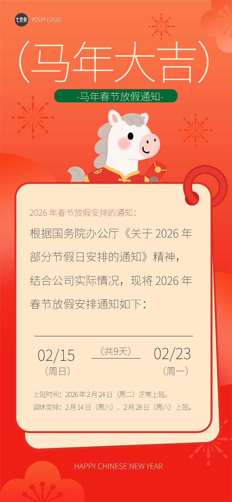 位置:首页>社交>手机海报>卡通马年春节放假通知全屏海报