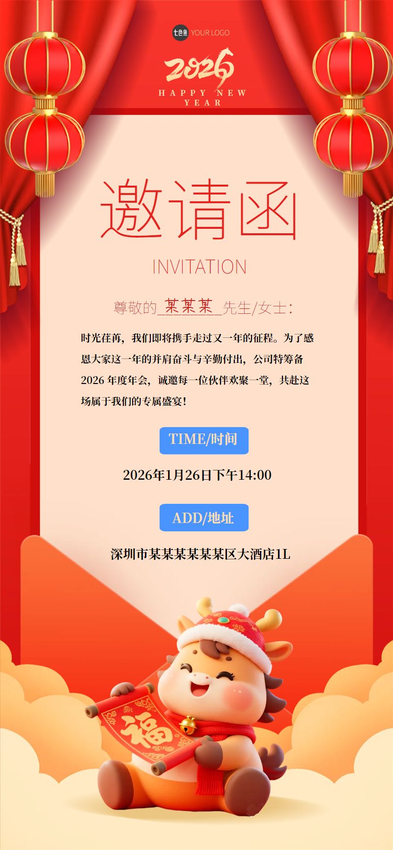 红色立体2026马年年会邀请函全屏海报是设计师 笨笨的作品,模板尺寸为720*1280px,属于?社交>?手机海报模板 ,模板图片素材均支持免费下载,在线就近下单印刷。操作简单易懂,会打字就会做设计,七色鱼界面友好上手快,可适用于多种场景。七色鱼拥有海量模板素材,30万+模板免费用,行业覆盖丰富,全部模板只需拖拉拽,轻松改。满足中小型企业、创业公司、自媒体、学生和个体经营者的自助平面设计需求,还可进行云端储存管理、分享协作、营销传播、在线下单印刷等。