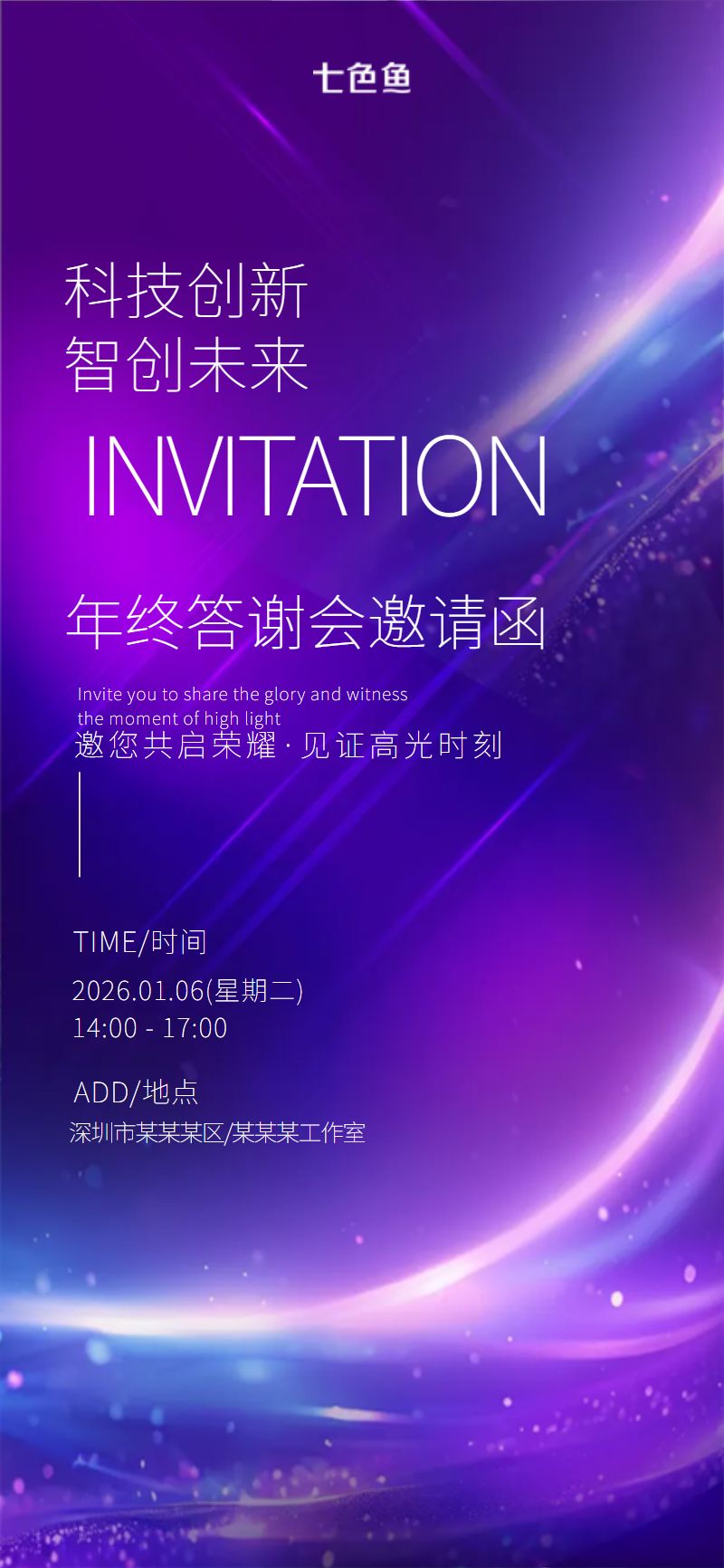 科技风2026年马年年终答谢会邀请函海报是设计师 笨笨的作品,模板尺寸为720*1280px,属于?社交>?手机海报模板 ,模板图片素材均支持免费下载,在线就近下单印刷。操作简单易懂,会打字就会做设计,七色鱼界面友好上手快,可适用于多种场景。七色鱼拥有海量模板素材,30万+模板免费用,行业覆盖丰富,全部模板只需拖拉拽,轻松改。满足中小型企业、创业公司、自媒体、学生和个体经营者的自助平面设计需求,还可进行云端储存管理、分享协作、营销传播、在线下单印刷等。